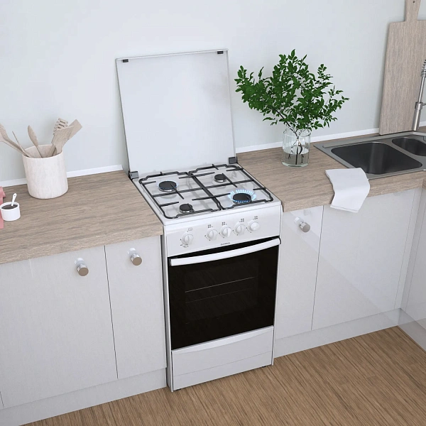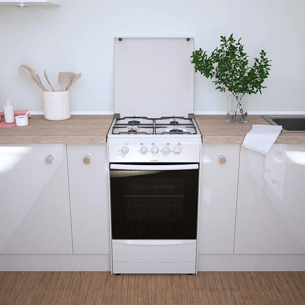 Над рабочим столом плиты установлена эмалированная крышка, предотвращающая попадание жира на фартук кухонного гарнитура.