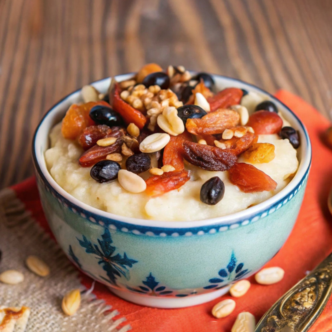 Подготовьте сухофрукты (промойте и залейте кипятком на 20 минут) и орехи (прокалите на сковороде).